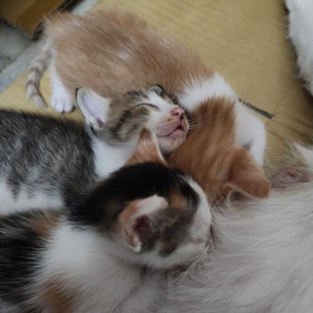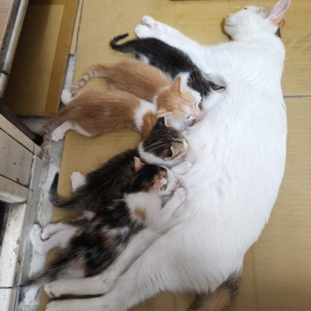 皆健康活潑,四公一母,只有三花是女生,其餘兩隻橘白和兩隻灰白都是男生,目前小貓們已會自己去貓砂盆上廁所,也可少量吃乾飼料和罐頭,因此很好照顧也不怕人,雖然好動但只要注意活動範圍沒有危險即可,貓媽媽原本是浪貓,收編回來後要帶去結紮時才發現已懷孕,再加上家裡已有另兩隻成貓,所以希望小貓們能遇見有緣人收養