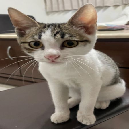 三個月半女生、對任何事情都非常有興趣、有人的時候會一直黏著你、親人、親貓。