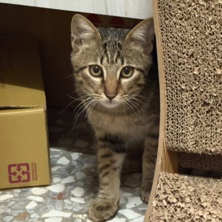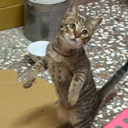 花色漂亮的虎斑貓,大約4個月大,個性溫柔,很喜歡玩逗貓棒!非常親貓,適合有貓家庭領養!目前三餐吃飼料!