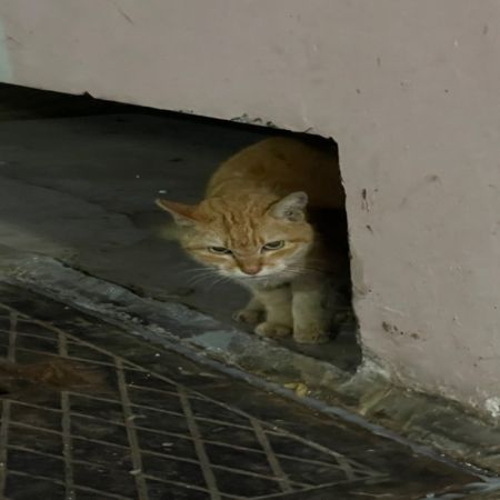 橘貓因下雨天進來社區躲雨超過四天,因無法自行離開,已多天未進食。