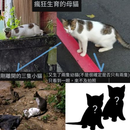 通報的三隻新生貓,還有他們的母貓,與母貓帶子期間又懷孕生的另兩胎小貓,該母貓原本帶的三隻小貓在5個月時便放棄他們,但還是在附近徘徊,以時間段放棄的過早,後來在45巷的空地倉庫,看到該母貓已經又生了兩隻小貓,瘋狂的生育機器,新的小貓大約1 2個月大,但是來不及拍照,抓起小貓,母貓就抓著小貓轉移了, 目前母貓與新小貓應該還在新北市新店區文中路33巷 & 新北市新店區北宜路一段45巷交界處藏匿徘徊, 而那些已獨立的3幼貓應該也很快會陷入增值生育機器循環, 需要抓紮 , 希望幫助。