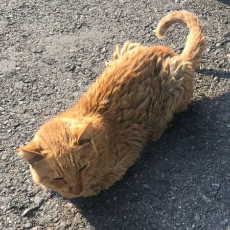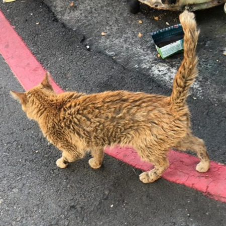 疑似違口炎貓,毛況非常糟糕,體態相當瘦弱,看起來沒什麼力氣