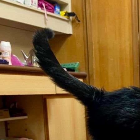 黑貓,約1歲半,已絕育,沒有戴項圈,外型適中不胖不瘦,性格較膽小,容易緊張,看到人會躲起來,尾巴折尾,肉球是黑色的,毛照到陽光或燈光會呈現咖啡色。