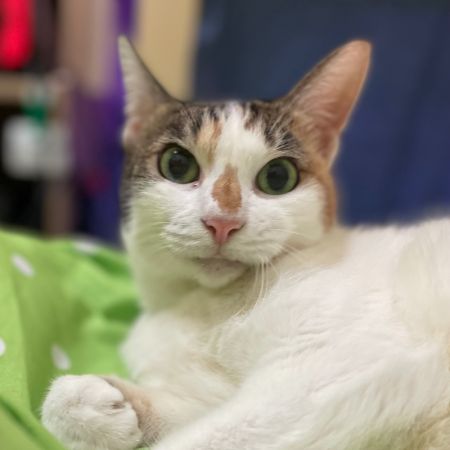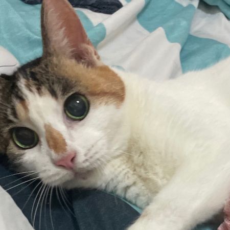 特徵:三花貓、白色為主,頭上是虎斑花紋,臉上與側邊有部分橘色