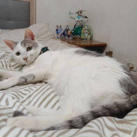 黑白色的米克斯,公貓已結紮,尾巴有混虎斑貓的花色,有黑色帶鈴鐺的項圈