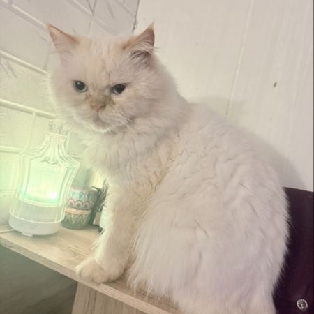 長毛貓咪,耳朵黃色,身體毛色米白